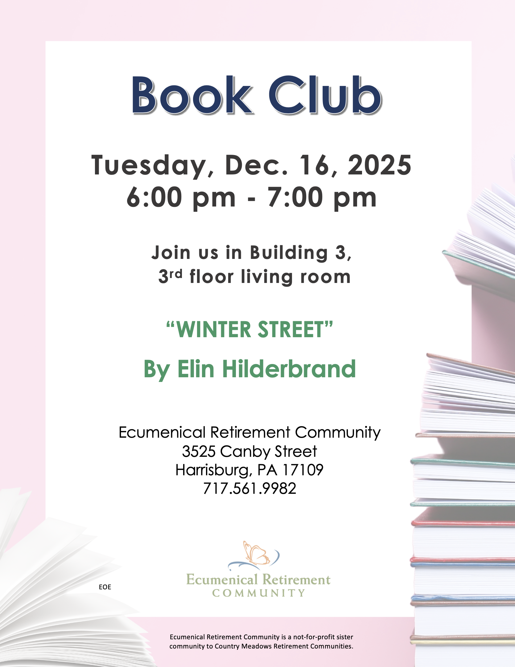 Ecumenical Retirement Community 624 Wilhelm Road, Harrisburg, PATuesday, Nov. 18, 2025 6:00 pm - 7:00 pm Join us in Building 3, 3rd floor living room “THE WOMEN” By Kristin Hannah